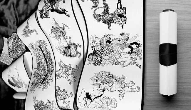18 cm x 4.8 m scroll print with or without wooden core and ribbon featuring a recreation of The Night Parade of One Hundred Demons in 19 drawings by 18 different artists.